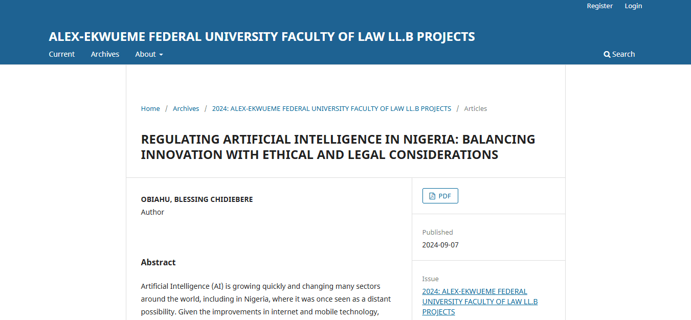 Researched and wrote an LL.B long essay examining the regulation of artificial intelligence in Nigeria, analysing gaps in existing technology laws and proposing a risk-based regulatory framework informed by comparative models from the EU, U.S., and China.